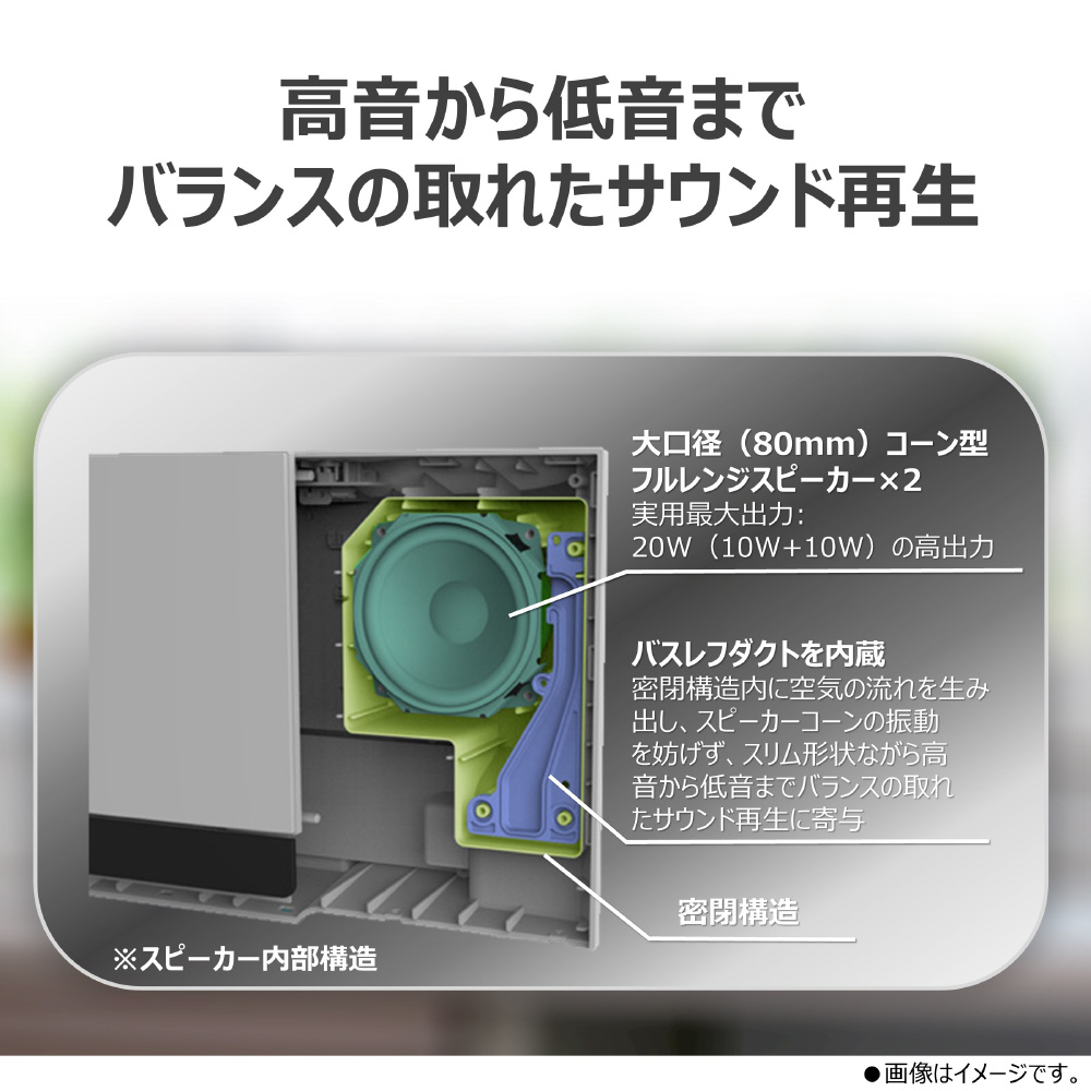 バフレスダクトを内蔵、密閉構造内に空気の流れを生み出し、スピーカーコーンの振動を妨げず、スリムな形状ながら高音から低音までバランスの取れたサウンド再生に寄与
