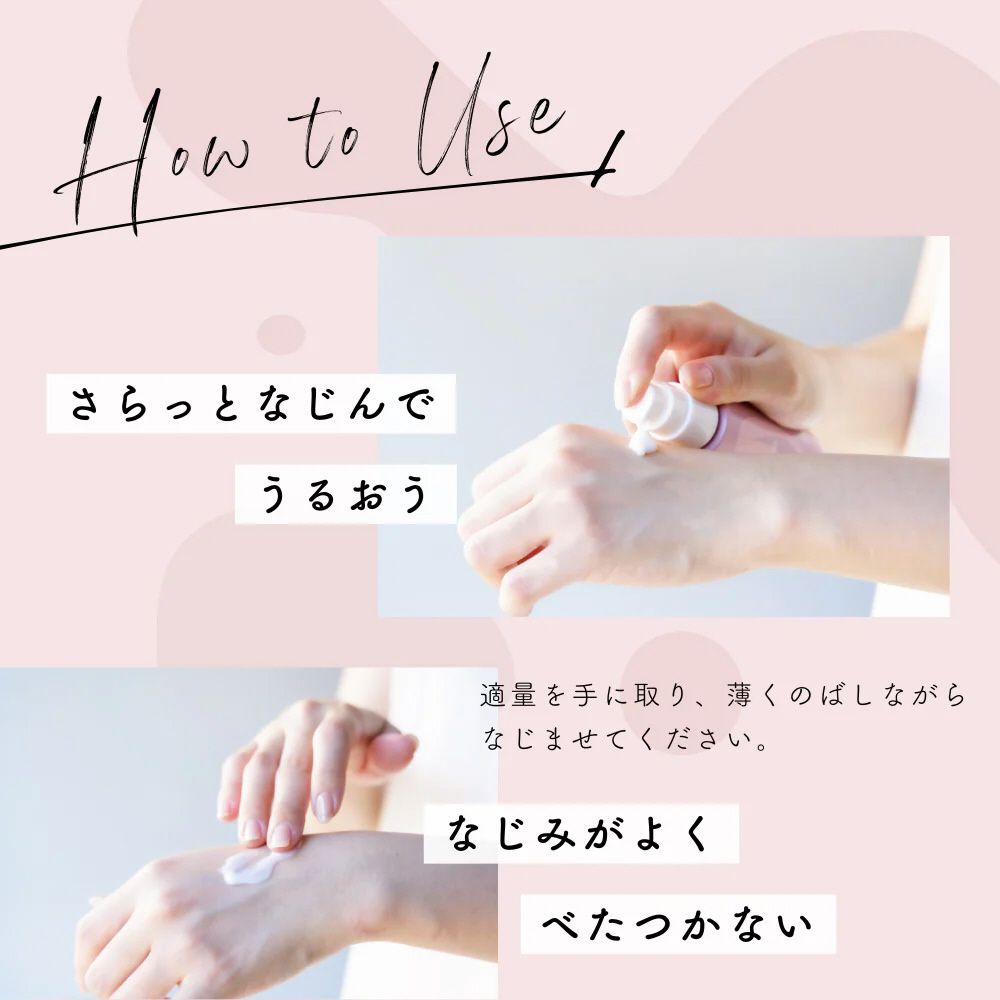 適量を手に取り、薄くのばしながらなじませてください。