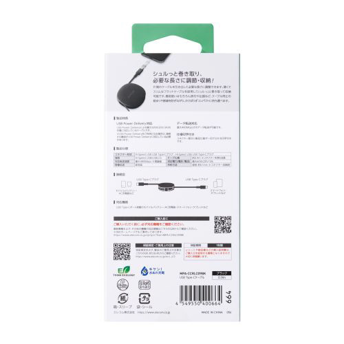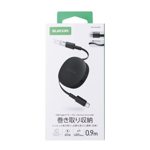 巻き取り式 充電ケーブル USB-C to USB-C 90cm PD60W データ転送対応 コンパクト収納 ブラック MPA-CCRLC09BK