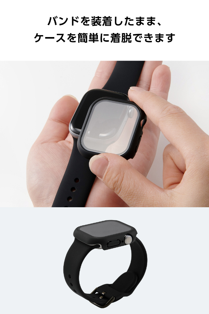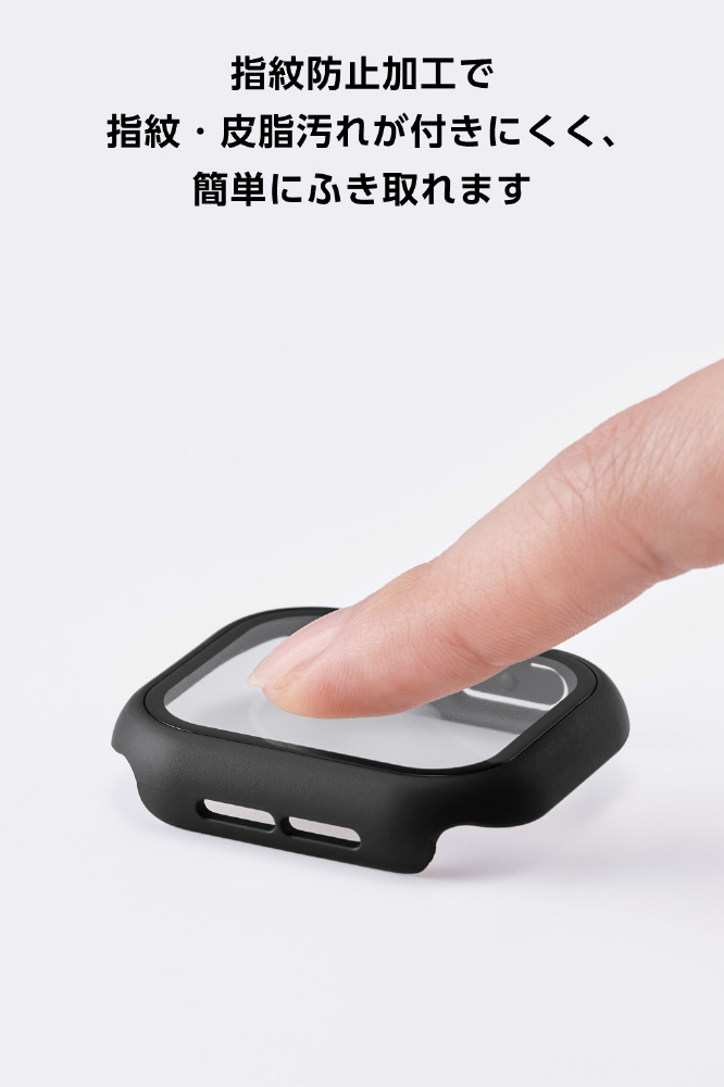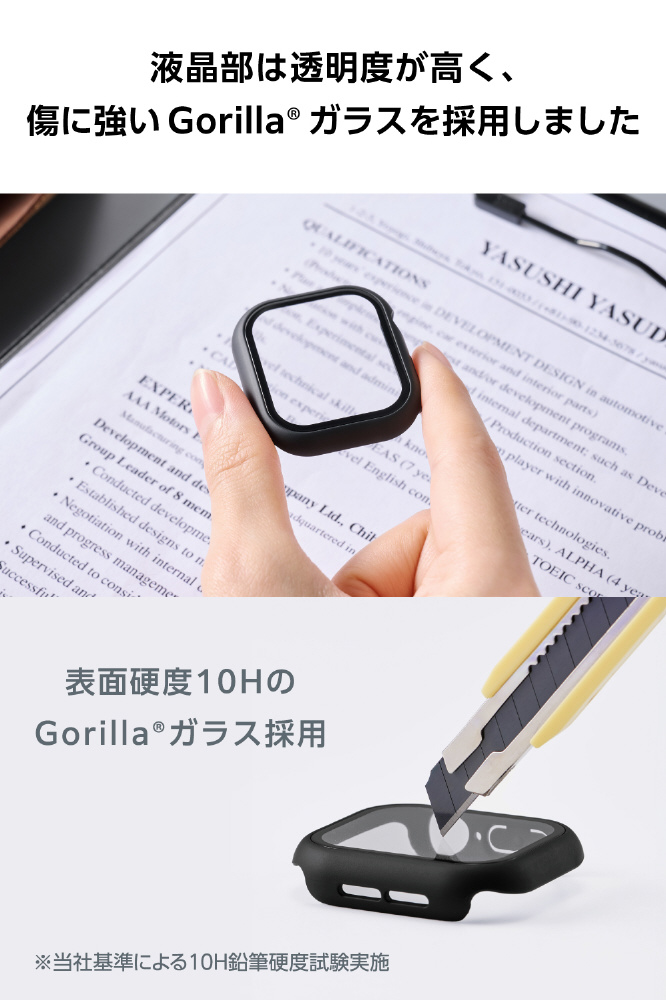 表面硬度10HのGorilla(R)ガラスと耐衝撃性の高いポリカーボネート素材の2重構造で、Apple Watchの画面および側面部を保護します。