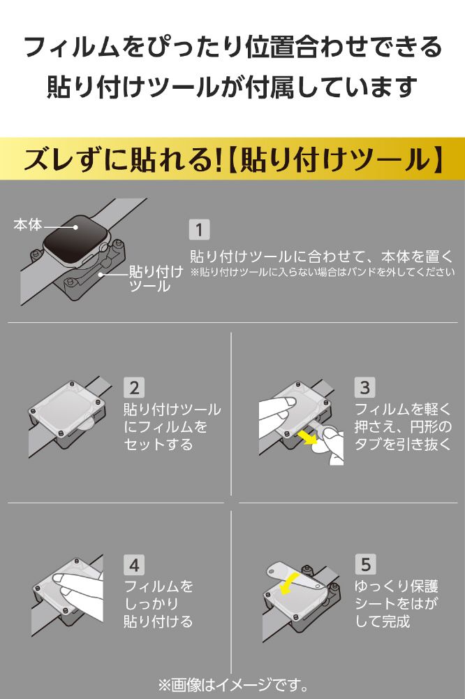 フィルム表面に付いた細かい傷が時間の経過とともに自然と目立たなくなる特殊フィルムを採用した、衝撃吸収、傷リペア、指紋防止タイプのApple Watch用フルカバーフィルムです。貼り付けの際に、ずれやすいフィルムをぴったりと位置合わせできる貼り付けツール付きです。