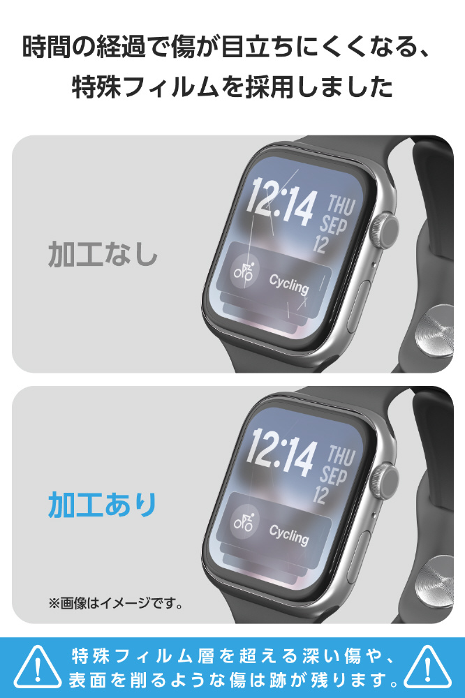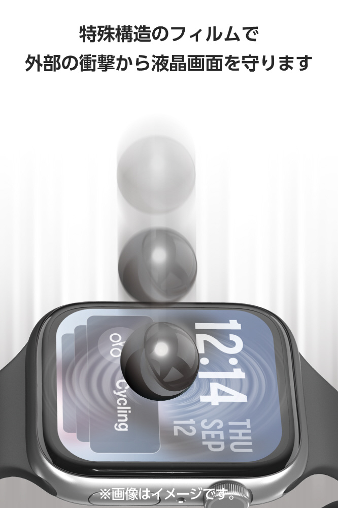 画面の曲面に沿った3D設計で、端末のデザインを損なわずに衝撃から守る衝撃吸収・傷リペア・指紋防止タイプのApple Watch用フルカバーフィルムです。
