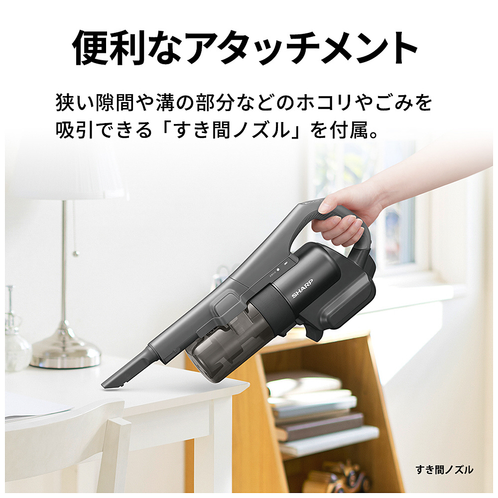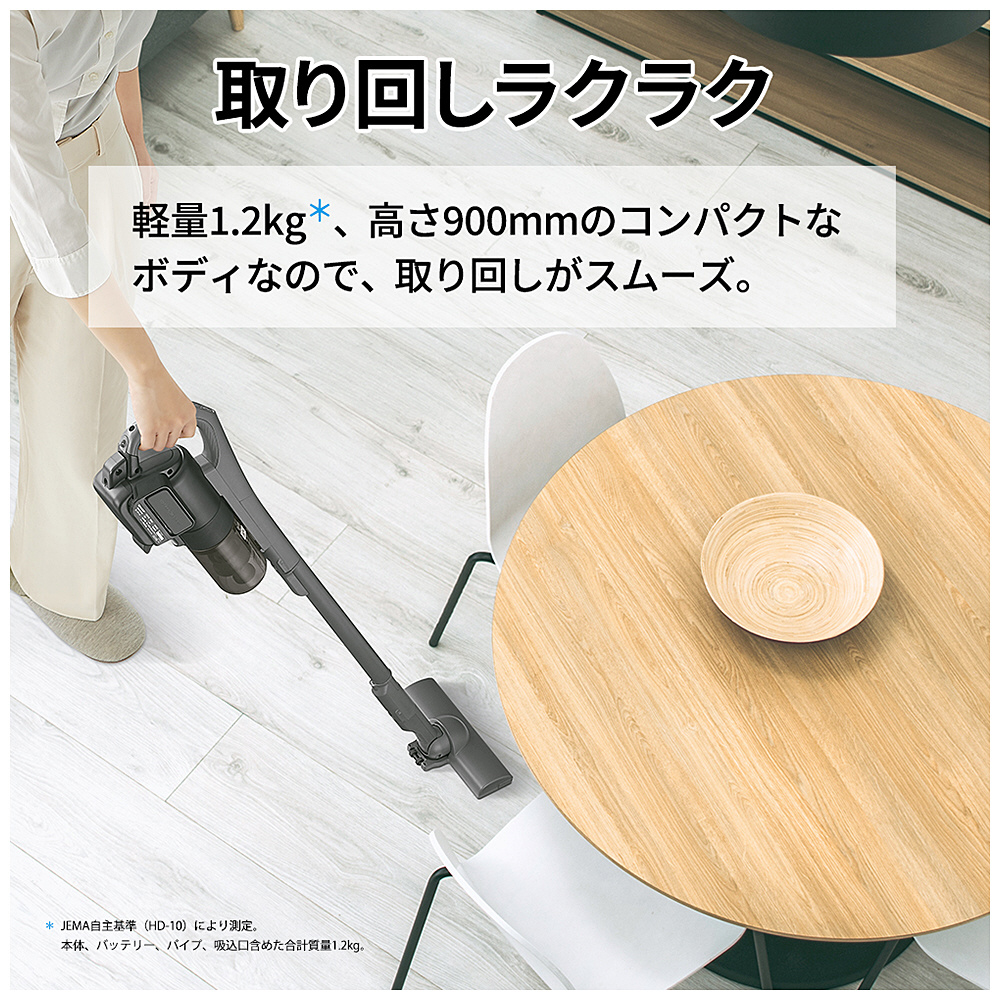 1.2kgと軽量なうえ、高さを900mmに抑えたコンパクトなサイズを実現。掃除の際スムーズに取り回しができ、すっきりと収納可能なので、ワンルームマンションなどで便利にお使いいただけます。また、一戸建て住宅においては、各階に備えておけば必要なときに取り出してサッと掃除することができます。手軽に使える“2台目”の掃除機としてもおすすめです。