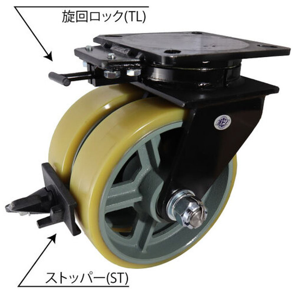 ヨドノ 鋳物超重荷重用双輪キャスター 自在車 ウレタン車輪 ストッパー旋回ロック付