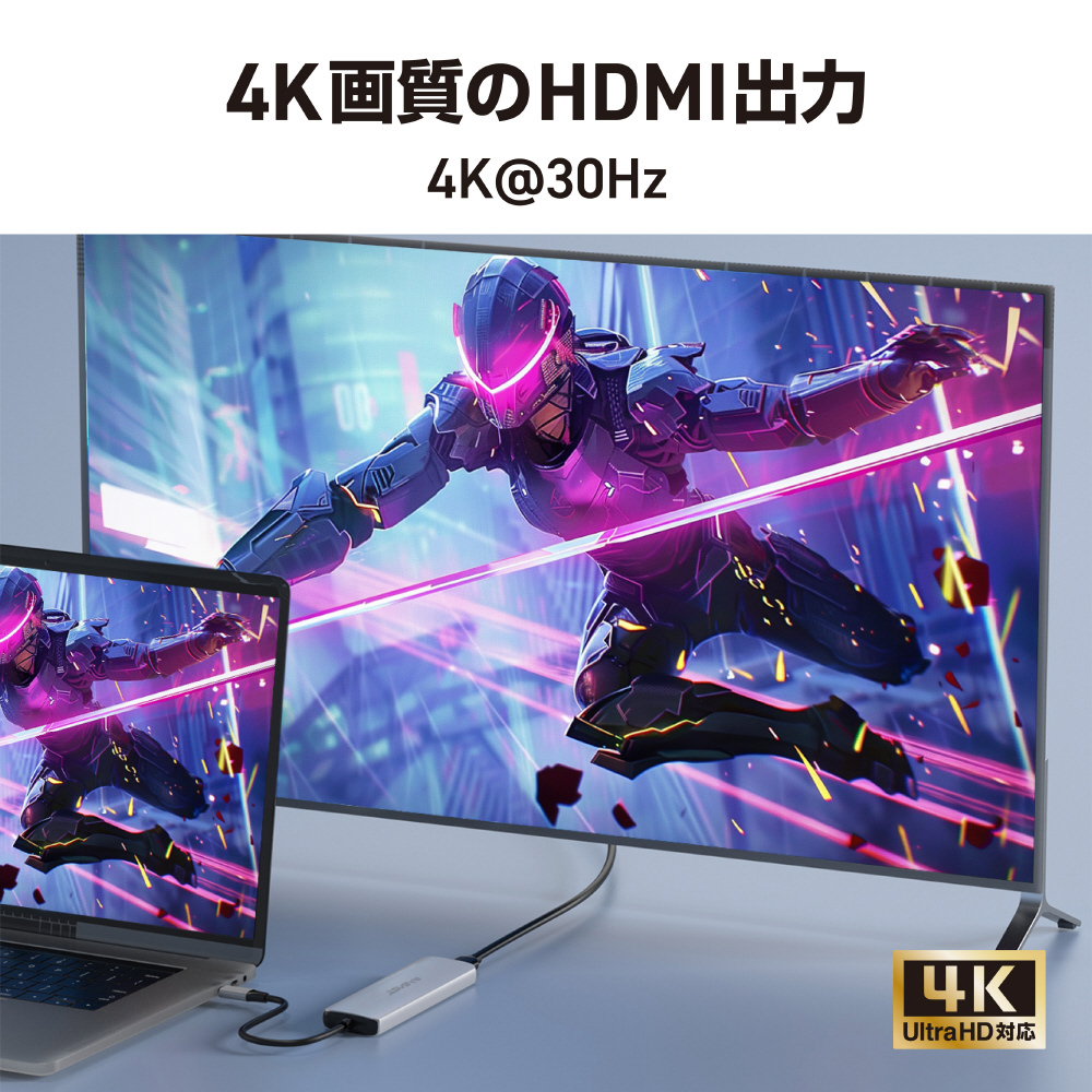 4K 30フレーム出力可能なHDMI端子を搭載。HDMI端子が無いノートパソコンでもHDMI出力が可能となります。