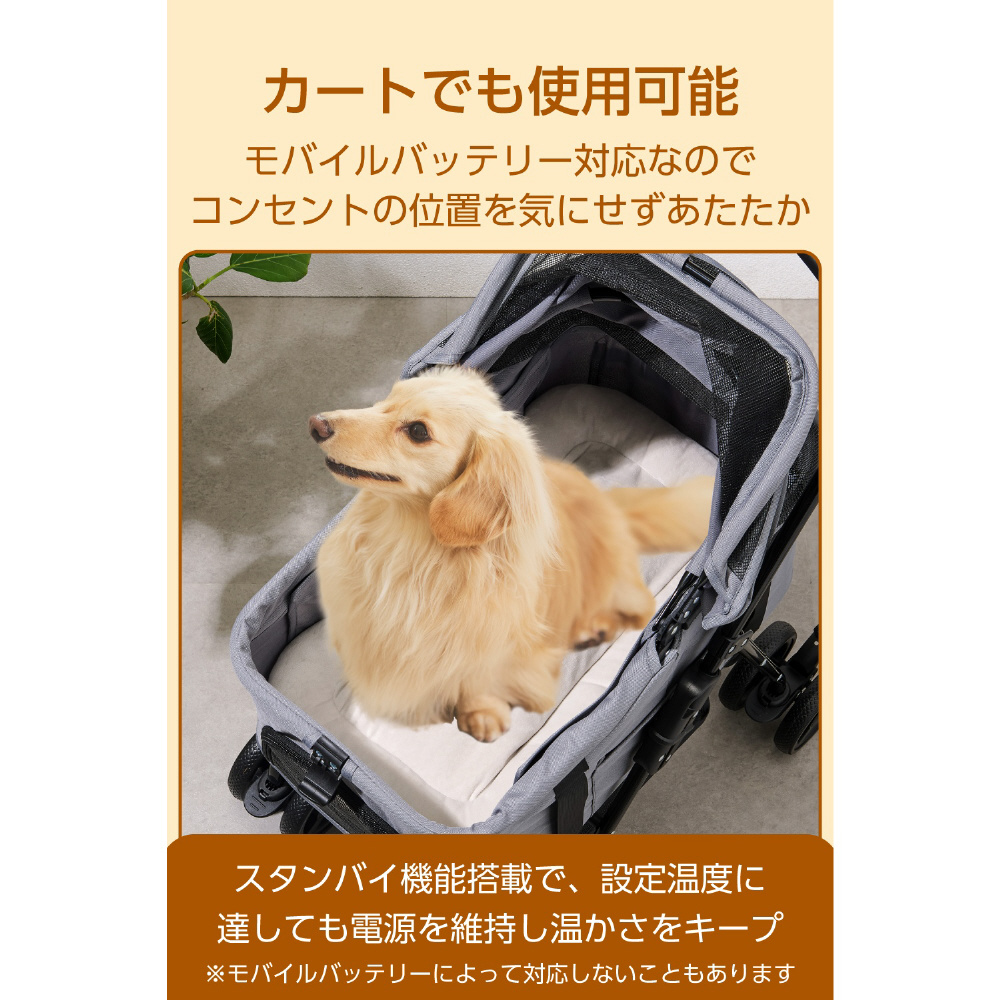 モバイルバッテリー対応なので、室内はもちろん、外出先にも持ち運んで使えます。旅行やアウトドアなど、ペットカートでお出かけする際にも活躍します。