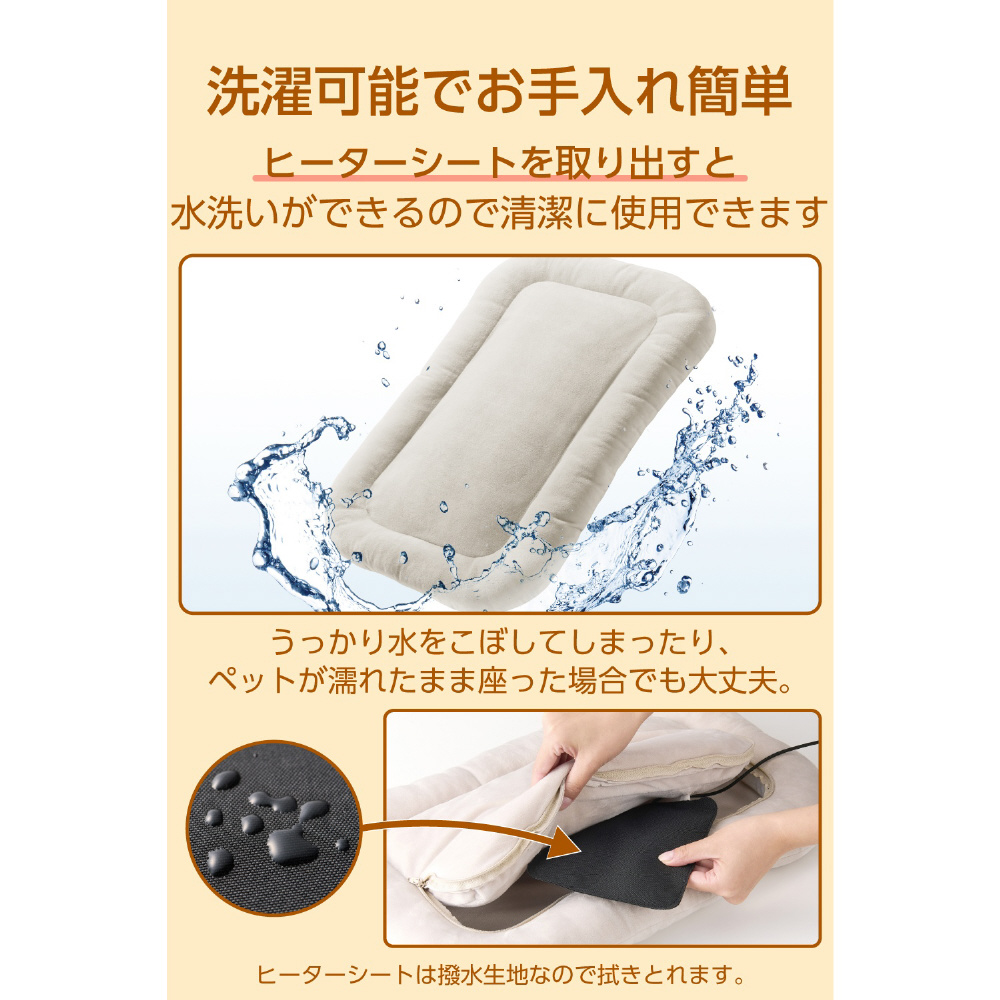 ヒーター部分を撥水生地で覆っているため、うっかり水がこぼれてしまった場合やペットが濡れたまま乗っても安心です。