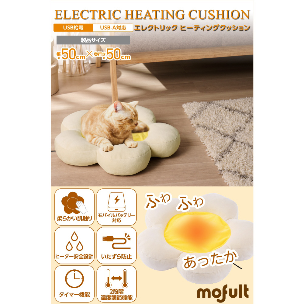 冬の暮らしを温かく快適に。柔らかな肌触りとふっくらした花びらのデザインで愛犬や愛猫がリラックスできる、USB給電式のヒーティングクッションです。モバイルバッテリー対応でコンセントがない場所でも使えます。外カバー・中クッションともに手洗いできるので、清潔を保ちながら繰り返し使えます。