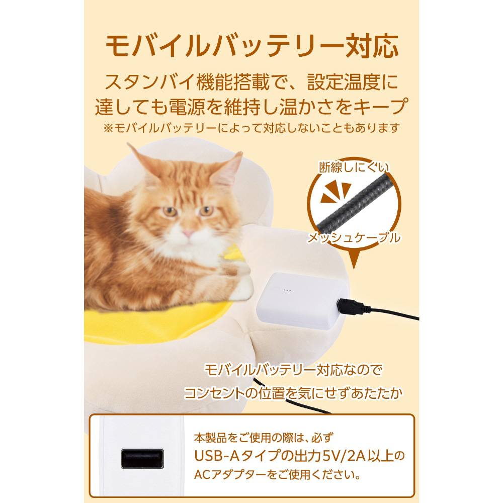 ペットヒーター クッション 犬 猫 ベッド・室内・持ち運びOK 花びら型 USB給電 モバイルバッテリー対応 2段階温度(約32/39℃) タイマー3/6h 撥水 洗濯可能 噛み対策メッシュケーブル クッションφ50cm ベージュ