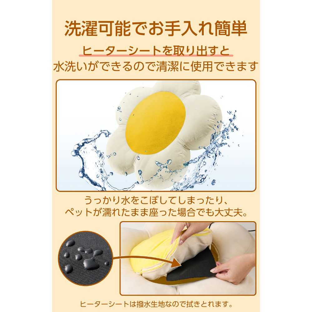 ヒーター部分を撥水生地で覆っているため、うっかり水がこぼれてしまった場合やペットが濡れたまま乗っても安心です。