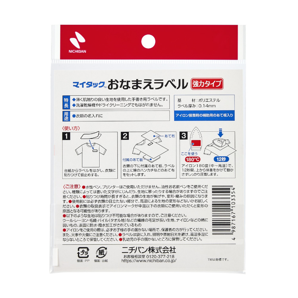 衣類などの布地にアイロンを使って接着することができるラベルです。接着後のラベルは約150回の洗濯・乾燥やドライクリーニングに耐えることができます。業務用の乾燥にも対応いたします。お子様の入園入学時や、介護施設に衣類を持ち込む時など衣類への名入れが必要な場合に便利です。