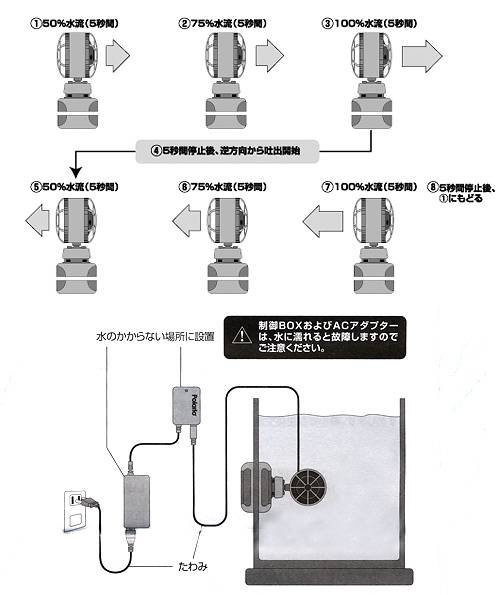 ●水流の勢いはあらかじめプログラム制御されており、一定時間、三段階に分けて水流が強まった後、反対方向へ水流が切り替わります。