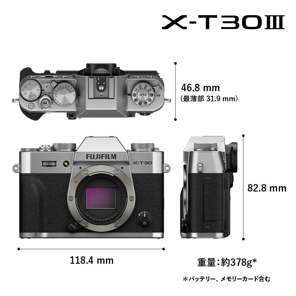 ・従来モデルである「X-T30 II」と同サイズ(幅118.4×高さ82.8×奥行46.8mm)、同質量(378g)を実現。「X-Tシリーズ」の系譜を受け継ぐセンターファインダースタイルのクラシックな外観と小型軽量なデザインは、毎日持ち歩きたくなる一台です。