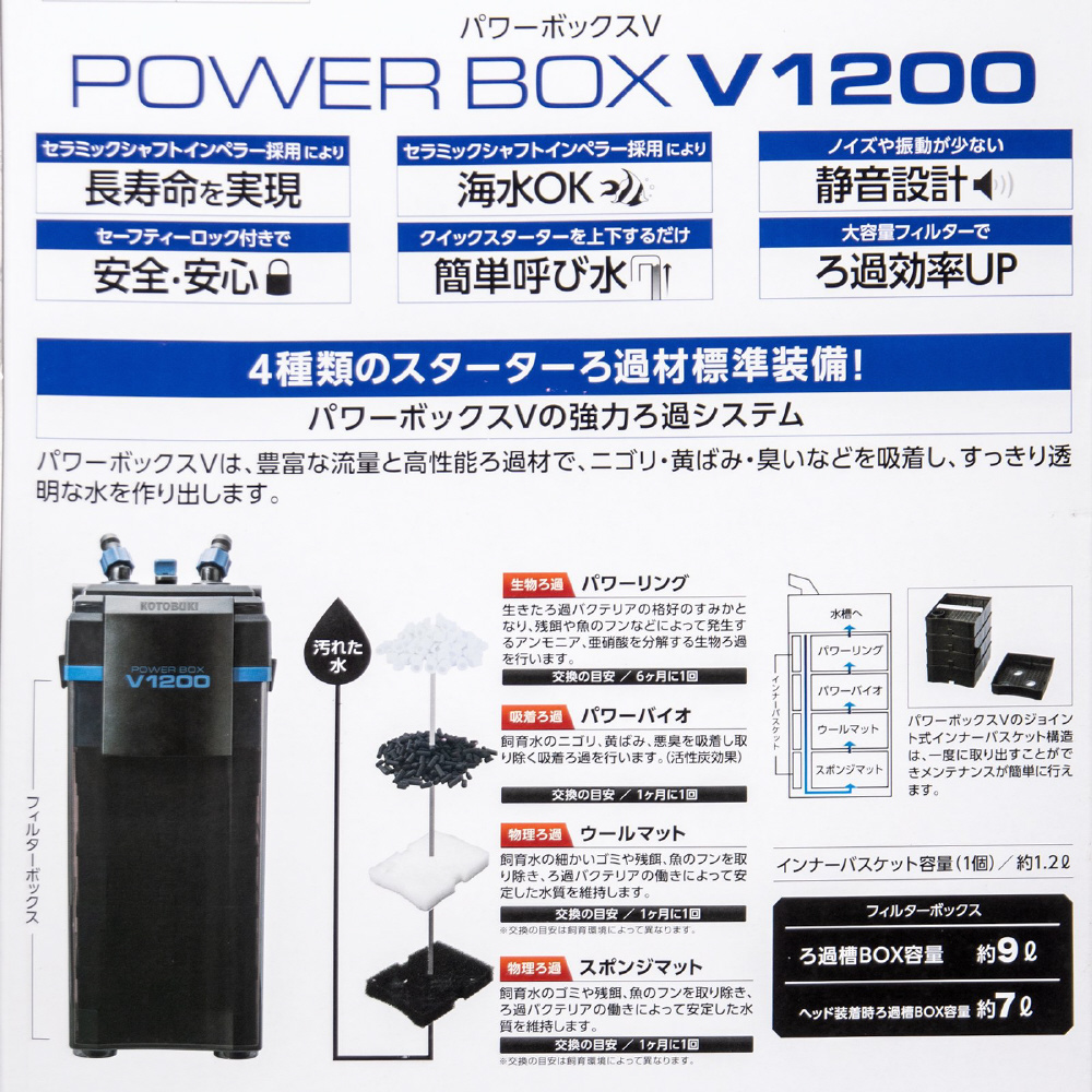定格電圧:AC100V50Hz/60Hz、定格消費電力:50Hz:10.7W、60Hz:12.5W、ポンプ流量:50Hz:930L/h、60Hz:1100L/h、水槽設置時ポンプ流量:50Hz:540L/h、60Hz:630L/h、ろ過ボックス容量:約9L(ヘッド装着時約7L)、1日24時間作動時の電気料金の目安(60Hzの場合):約9.3円、適合ホース、送水:ホース内径16mm用、給水:ホース内径16mm用