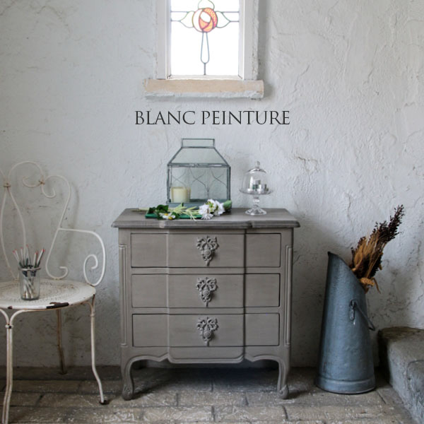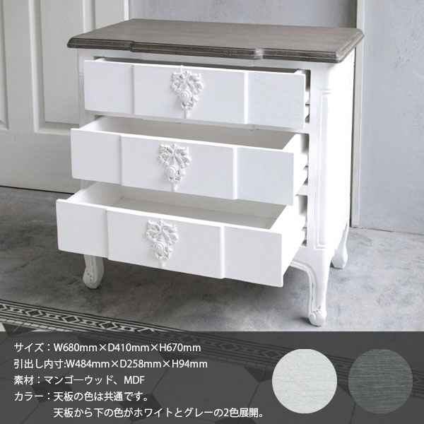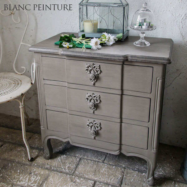 引出し3杯のフレンチチェスト、取手はおしゃれなデザイン取手に