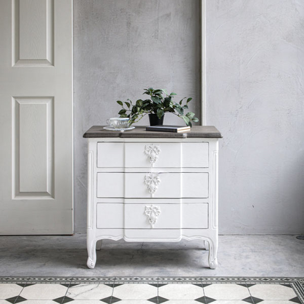 引出し3杯のフレンチチェスト、取手はおしゃれなデザイン取手に