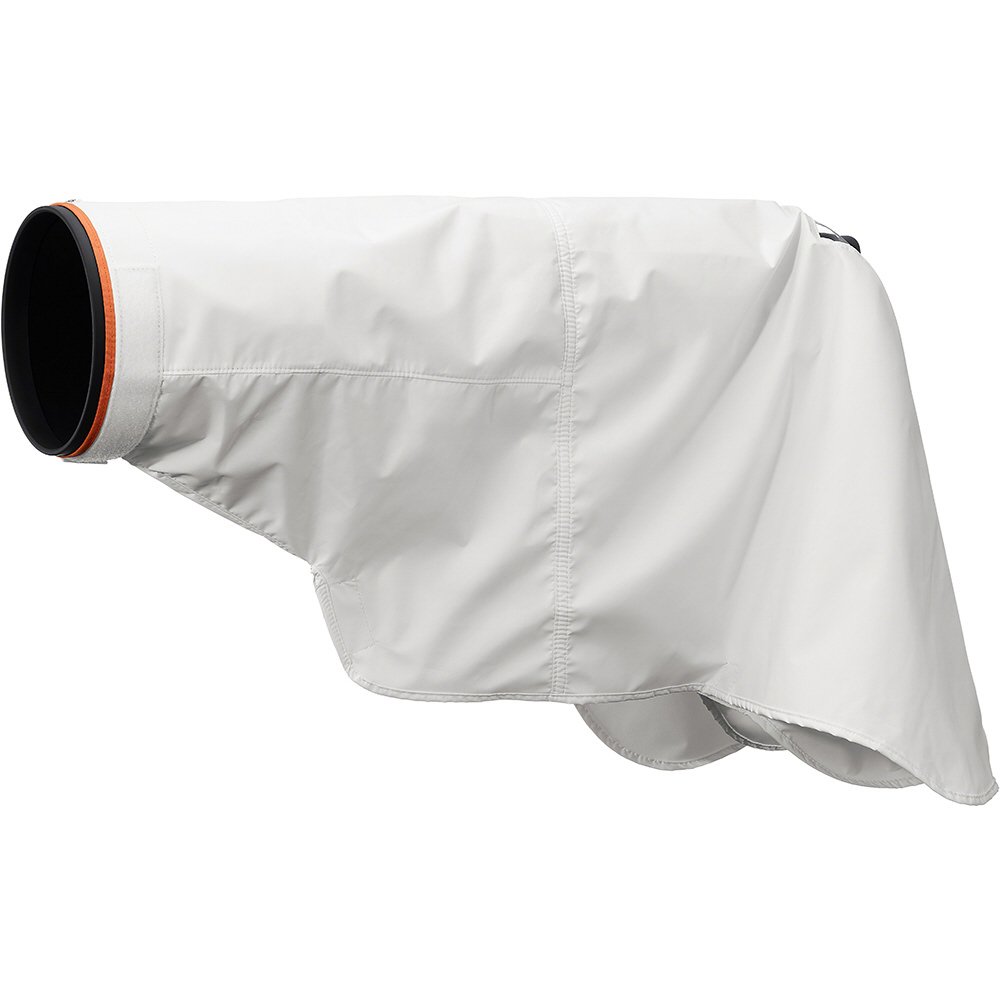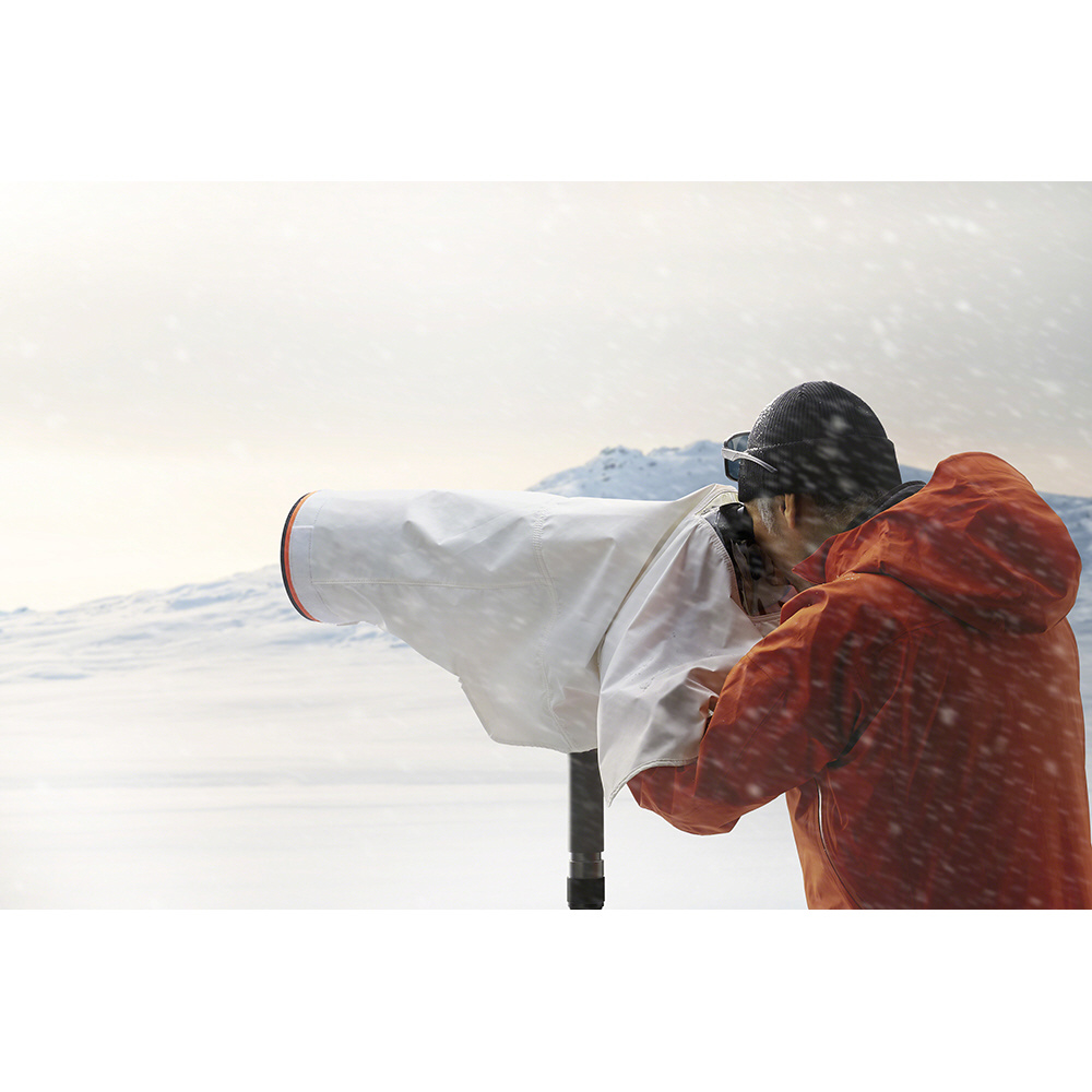 ・    面ファスナー機構により防滴、耐風性能を損なわず降雨・降雪時に容易にカメラおよびレンズに脱着でき、機材を保護しながらの撮影が可能