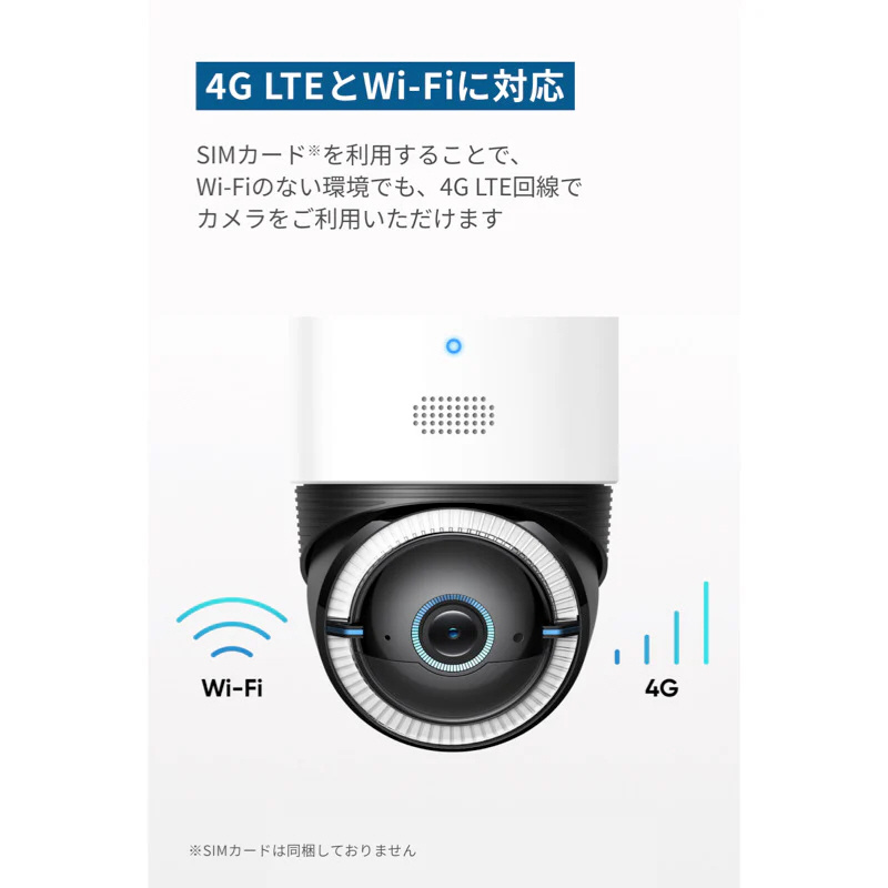 サイズ :約90×90×144mm、解像度:4K (約800万画素)、画角:138°、記録媒体:microSDカード(最大128GB)、接続タイプ:(2.4GHz) Wi-Fi / 4G LTE、可動範囲:水平方向 344° / 垂直方向 70° 、通話機能:双方向通話、バッテリー駆動時間 :約30日、夜間撮影モード:カラー、入力:5V=2.5A (Type Cポート)