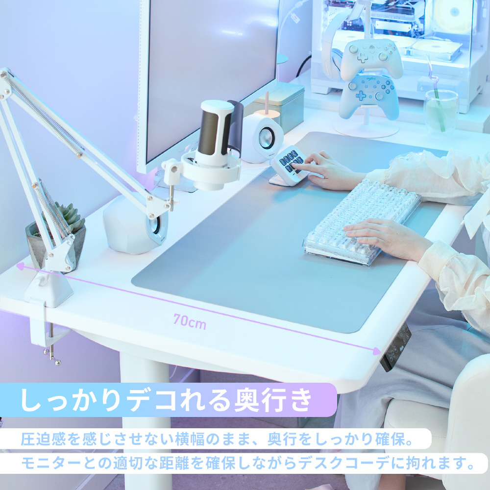 モニターや周辺機器をゆったり配置でき、長時間のプレイや作業でも快適な環境を実現します。