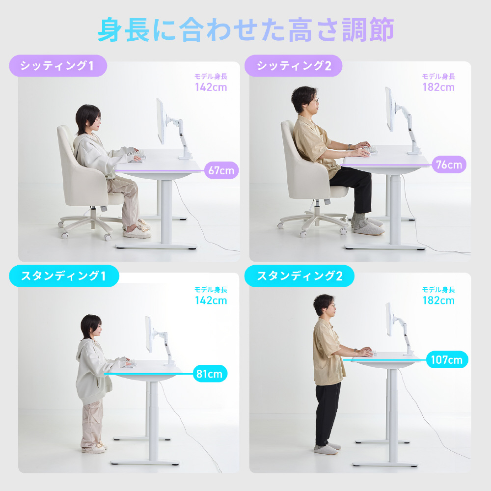 最大60cmの昇降幅で、座り作業から立ち作業まで無段階で調整が可能。