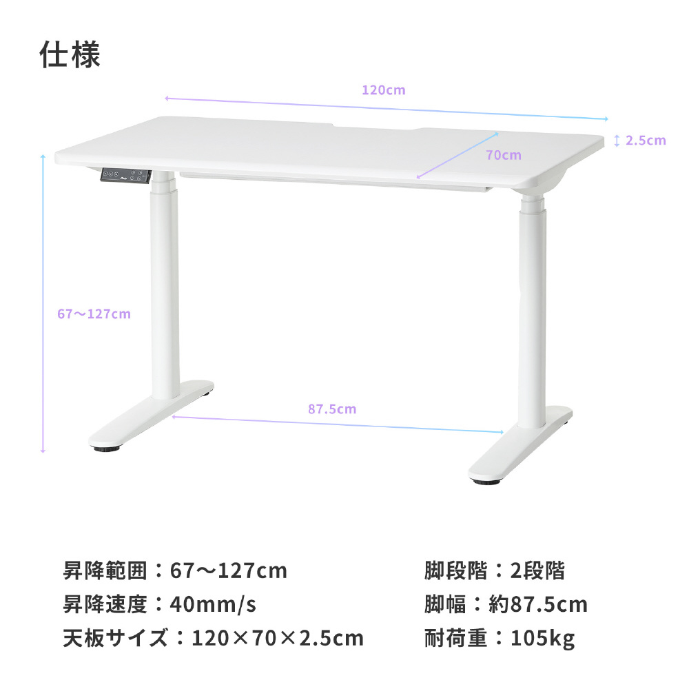 電動昇降ゲーミングデスク [W1200xD700xH670〜1270mm] ホワイト PXDS1200EWH-O