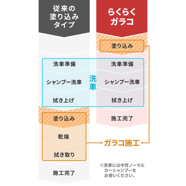 らくらくガラコは洗車の準備時間で乾燥するから実質待ち時間はゼロ。また、拭き取り工程が不要になるので施工ムラが激減する上、洗車により余剰成分が残らずギラつきのないクリアな仕上がりとなります。