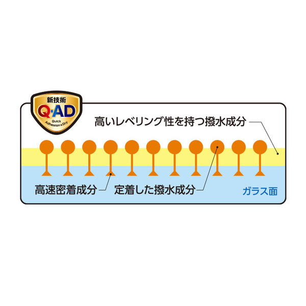 高密着成分(QA)で撥水成分が瞬時に洗車可能なレベルに定着。高いレベリング性で速乾性(QD)と均一な仕上がりを両立。