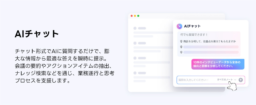 会議の要約やアクションアイテム抽出、ナレッジ検索などを通じ、業務遂行と思考プロセスを支援します。