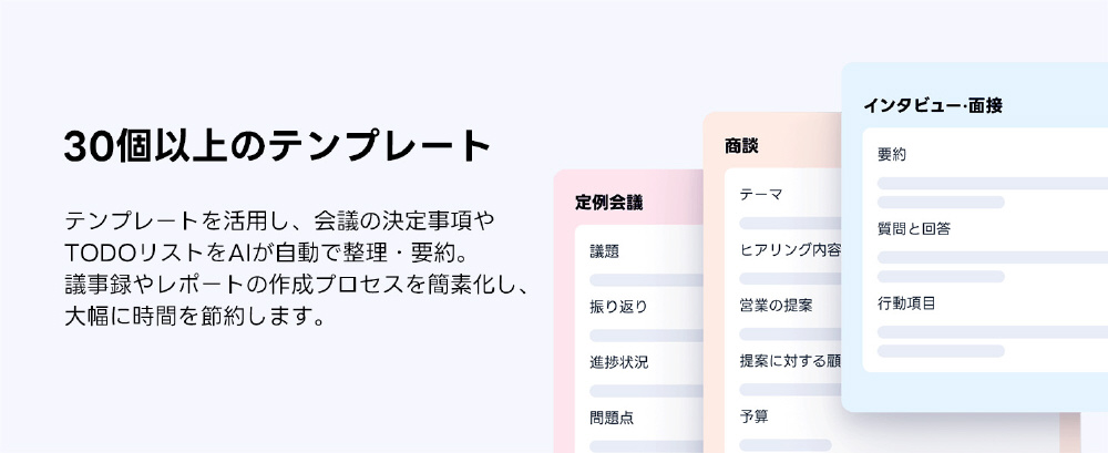 テンプレートを活用し、会議の決定事項やTODOリストをAIが自動で整理・要約。