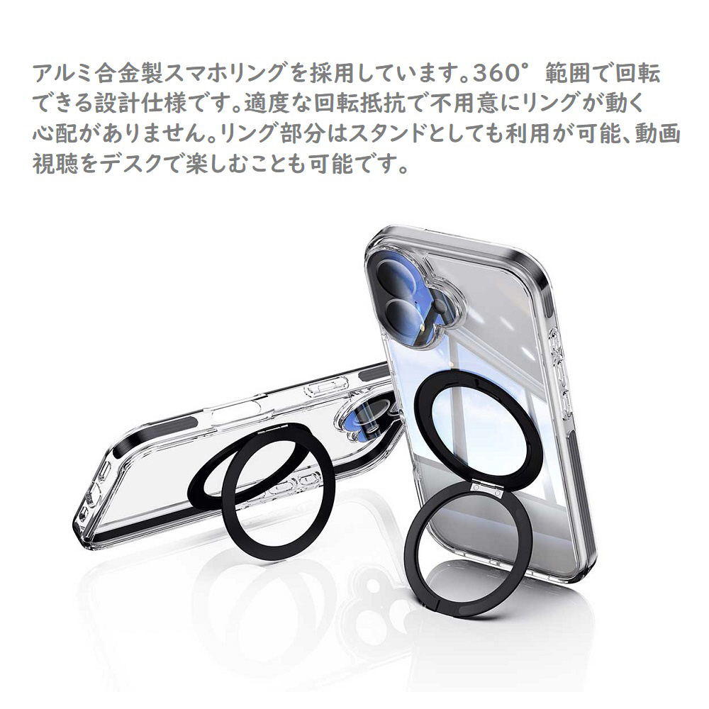 アルミ合金製スマホリングを採用。360°範囲で回転できる仕様です。