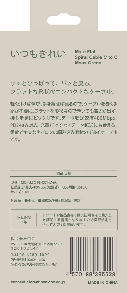 USB-C ⇔ USB-Cケーブル [充電 /転送 /1.0m /PD240W /USB2.0] モスグリーン CIO-NLSC-FL-CC1-MGR [USB-C ⇔ USB-C]