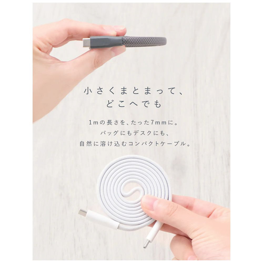 薄いフラットケーブルに磁石を内蔵。厚みを抑えた渦巻き状にきれいにまとまるため、非常にコンパクトにまとまります。体積をとらないのでカバンやポーチの隙間にスッキリ収まります。ナイロンの編み込み素材は柔軟で丈夫です。