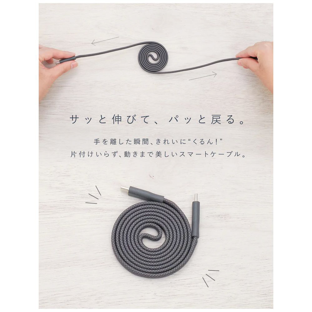 ケーブル部分に磁石を内蔵。ケーブル同士がくっついて、渦巻き状にきれいにまとまります。端子部分を持って、軽く引けばサッと展開し、手を離せば、渦巻き状に戻ります。ケーブルバンドなしにきれいにまとまる。コードリールのように使える便利なケーブルです。