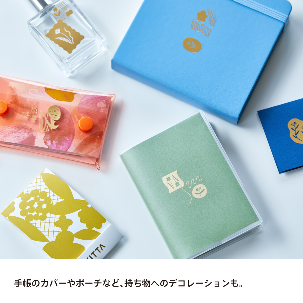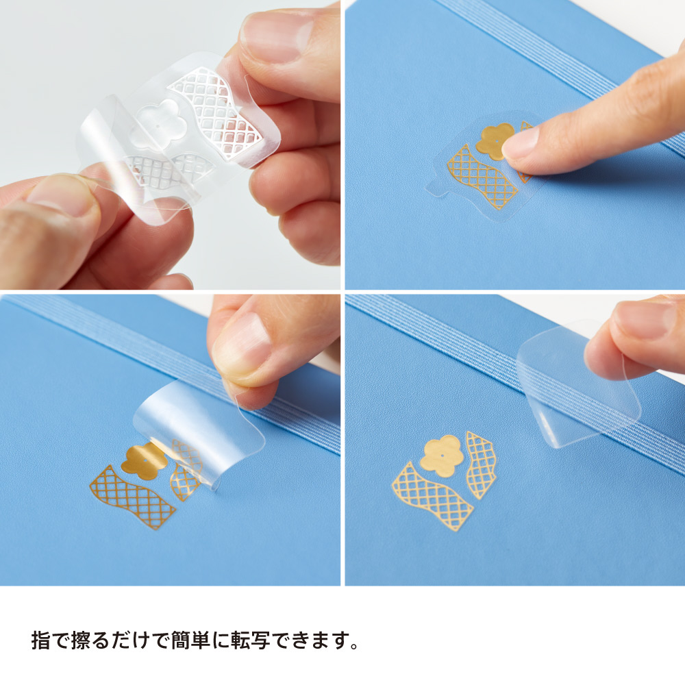 元から箔押しされているような仕上がりの転写シール。持ち運びがしやすい収納ケース付きです。