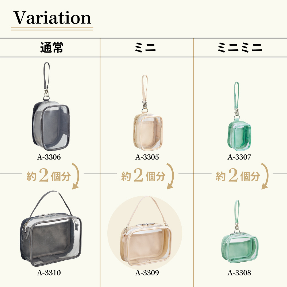 デコレーションできる透明シート2枚付き(側面にセットできる帯状のものと背面ポケット用のカードシート).デコレーションしたシートを側面と背面ポケットにセットするとオリジナルデザインのポーチが作れます。別売りのアレンジショルダーベルト(A−3320)を付けるとショルダーバッグとしてもお使いいただけます。