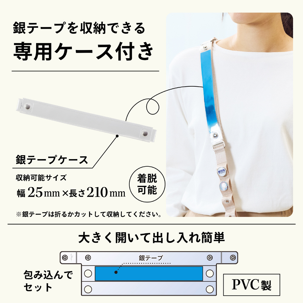 付属の銀テープケースにお気に入りの銀テープを入れてアレンジできます。ピンバッジやキーホルダーを付けられるホール付き。※幅25×長さ210mm以上の銀テープを収容する場合は折るかカットして収納してください。