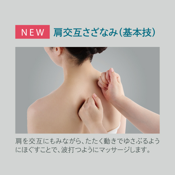 従来のもみ/たたき/さざなみ/背すじ伸ばしに加え、新たに「肩交互もみ」と