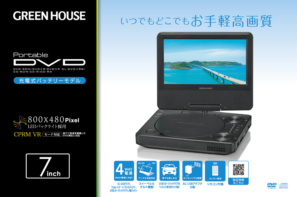 7型ワイド液晶(800×480)搭載のポータブルDVDプレーヤー