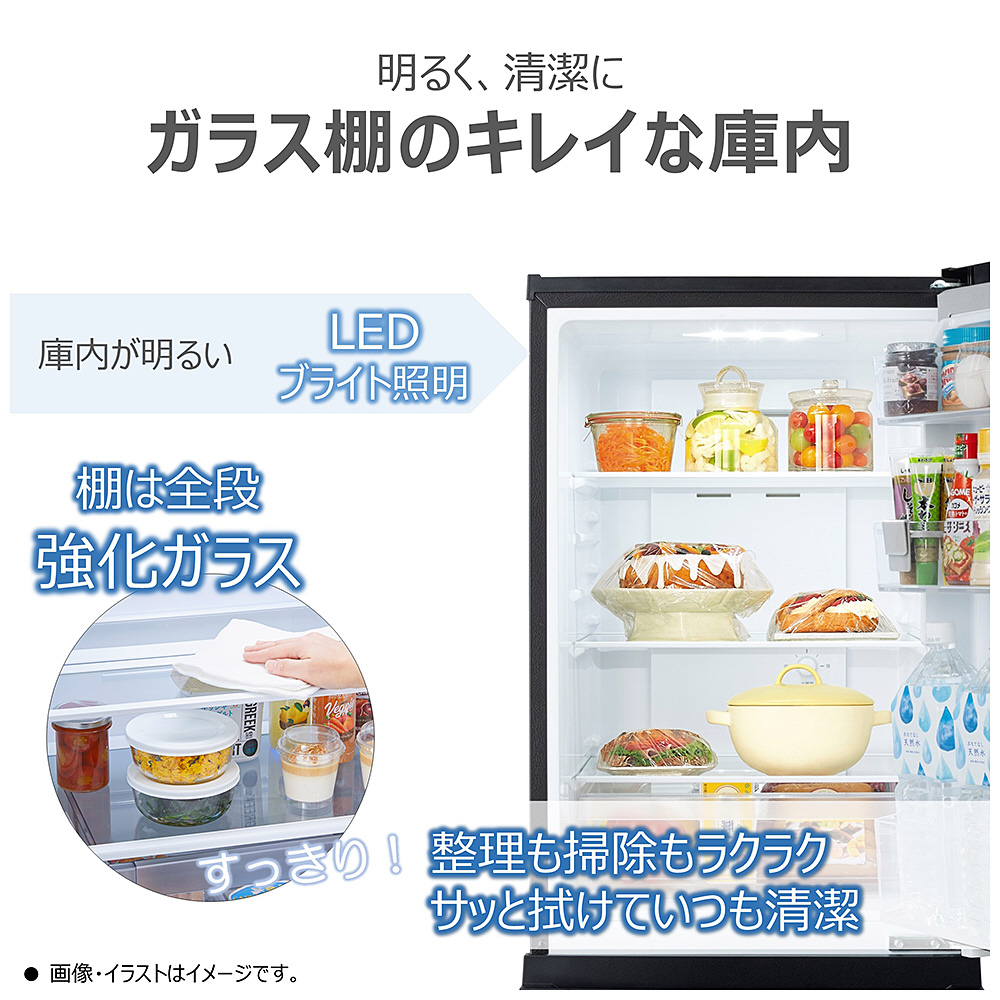 使いやすさにこだわり、シングルライフにぴったりな2ドアタイプ。2Lのペットボトルが3本も入るほか、冷蔵室のガラス棚も3段タイプ。コンパクトなのに使いやすい。