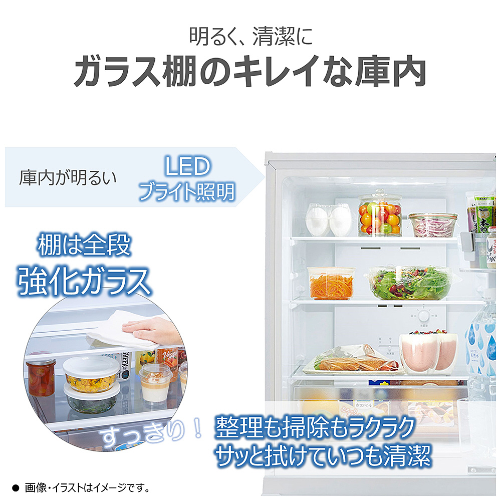 クリアで見渡しやすくお掃除も簡単なガラス棚を採用。たっぷり入り、整理しやすい3段ドアポケットも採用。