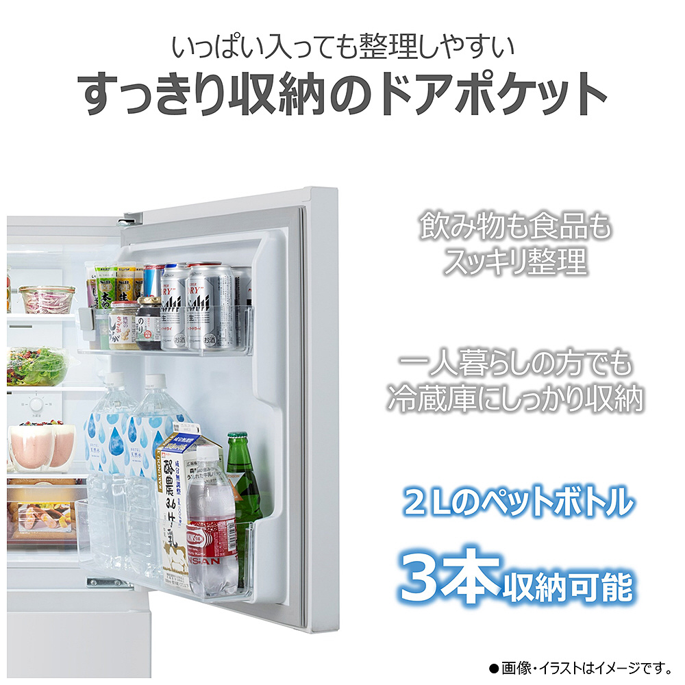使いやすさにこだわり、シングルライフにぴったりな2ドアタイプ。2Lのペットボトルが3本も入るほか、冷蔵室のガラス棚も3段タイプ。コンパクトなのに使いやすい。