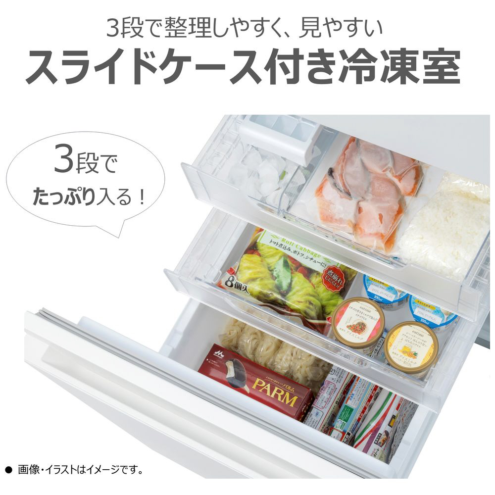 クリアで見渡しやすくお掃除も簡単なガラス棚を採用。たっぷり入り、整理しやすい3段ドアポケットも採用。