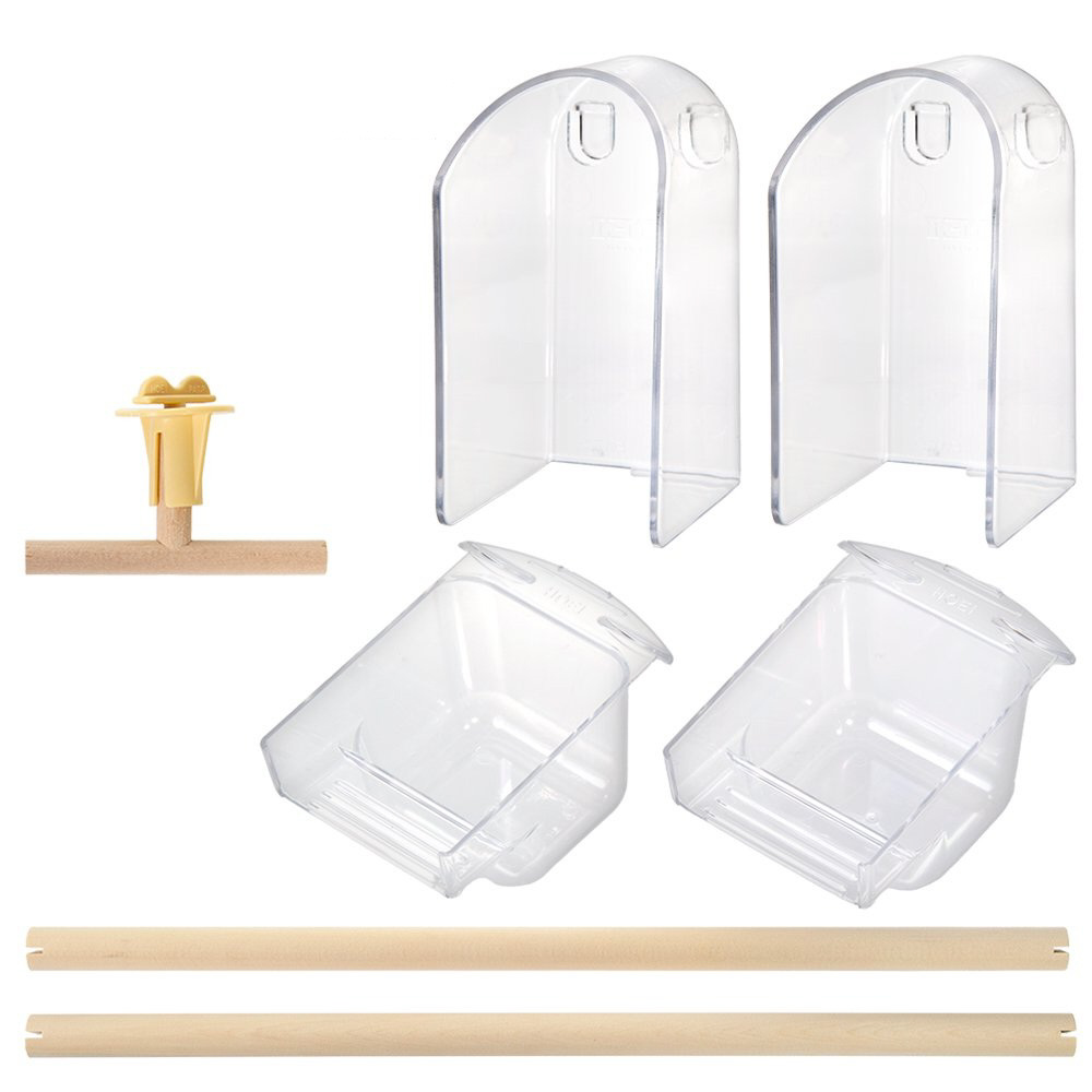 天井アミ×1枚、本体横付前アミ×1枚、本体横付後アミ×1枚、35用底(引き出し付)×1枚、35用足付フンキリアミ×1枚、35用水漏れ防止枠(シャッター付)×1枚、35横アミ用止まり木15パイ×2本、ホルダー付きT字止まり木12パイ105mm×1本、35クリアカップ×2ヶ、35用エサカバー×2ヶ