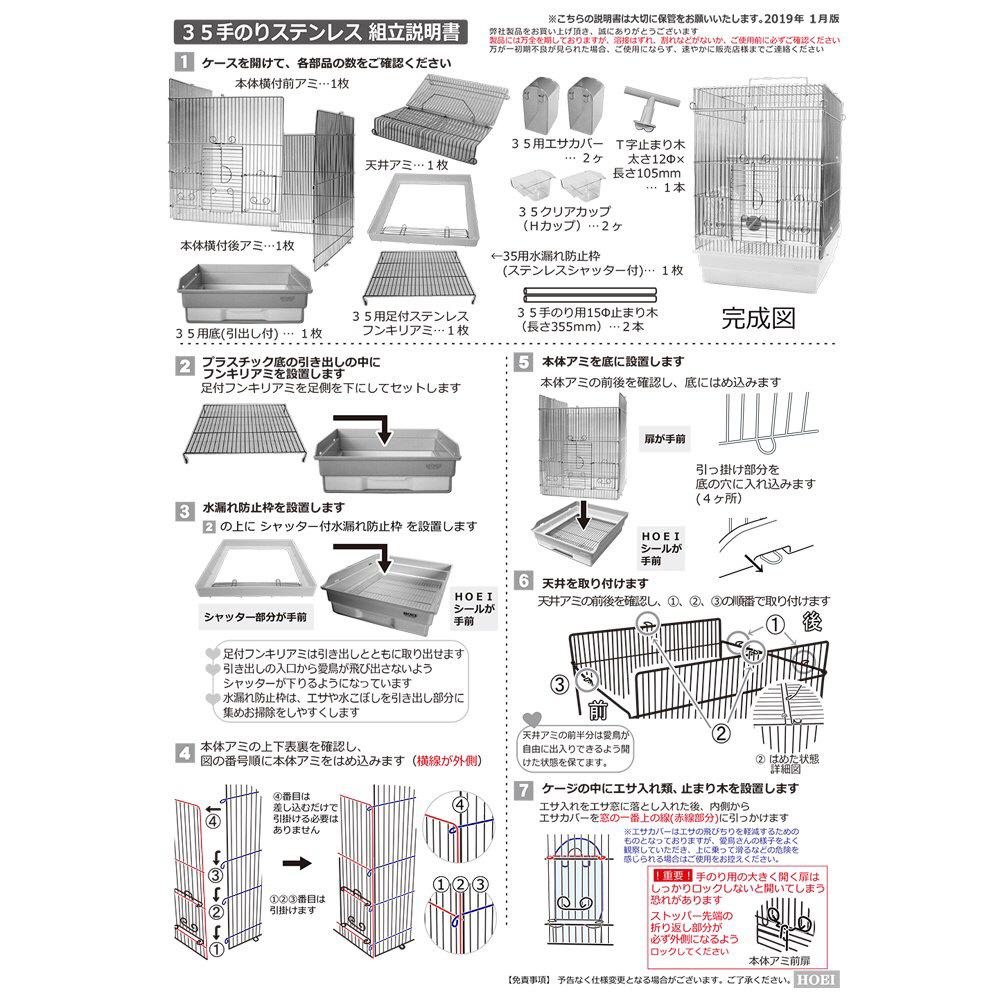 天井アミ×1枚、本体横付前アミ×1枚、本体横付後アミ×1枚、35用底(引き出し付)×1枚、35手のりステンレス用足付フンキリアミ×1枚、35用水漏れ防止枠(ステンレスシャッター付)×1枚、35手のり用止まり木15パイ×2本、ホルダー付きT字止まり木12パイ105mm×1本、35クリアカップ×2ケ、35用エサカバー×2ケ