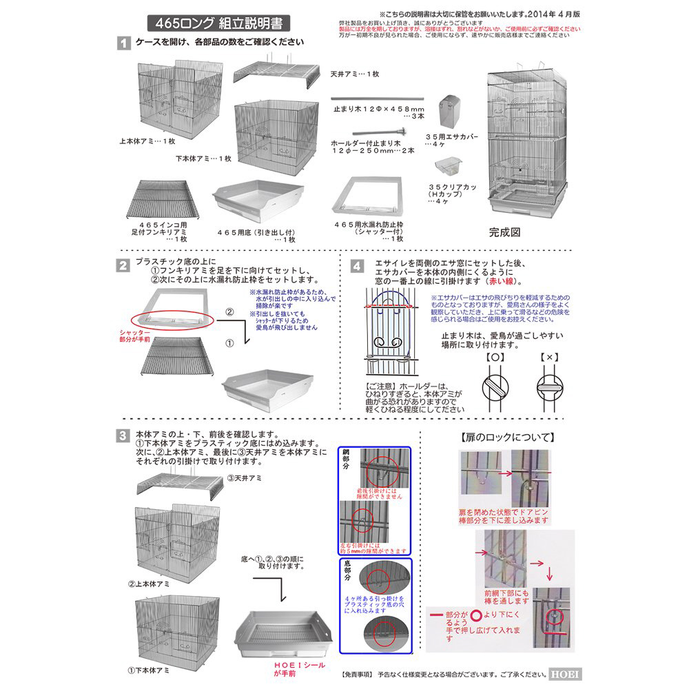 天井アミ×1枚、上本体アミ×1枚、下本体アミ×1枚、465用底(引出し付)×1枚、465用水漏れ防止枠(シャッター付)×1枚、465インコ用足付フンキリアミ×1枚、465‐12パイ止まり木×3本、ホールダー付止まり木12パイ250mm×2本、35クリアカップ×4ヶ、35用エサカバー×4ヶ