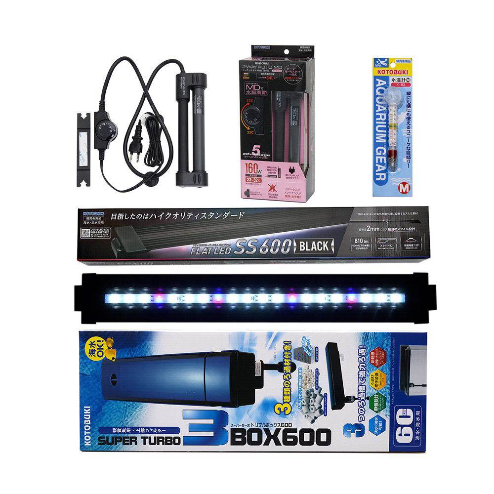 60cmフレーム付きガラス水槽:「コトブキプログレ600」(ガラスフタ1枚つき)、LED照明:コトブキフラットLEDSS600ブラック、上部式フィルター:コトブキスーパーターボトリプルボックス600、ヒーター:コトブキツーウェイオートMD160W、バックスクリーン(ブルー・ブラックリバーシブル※パッケージなし)、水温計、飼育の手引き