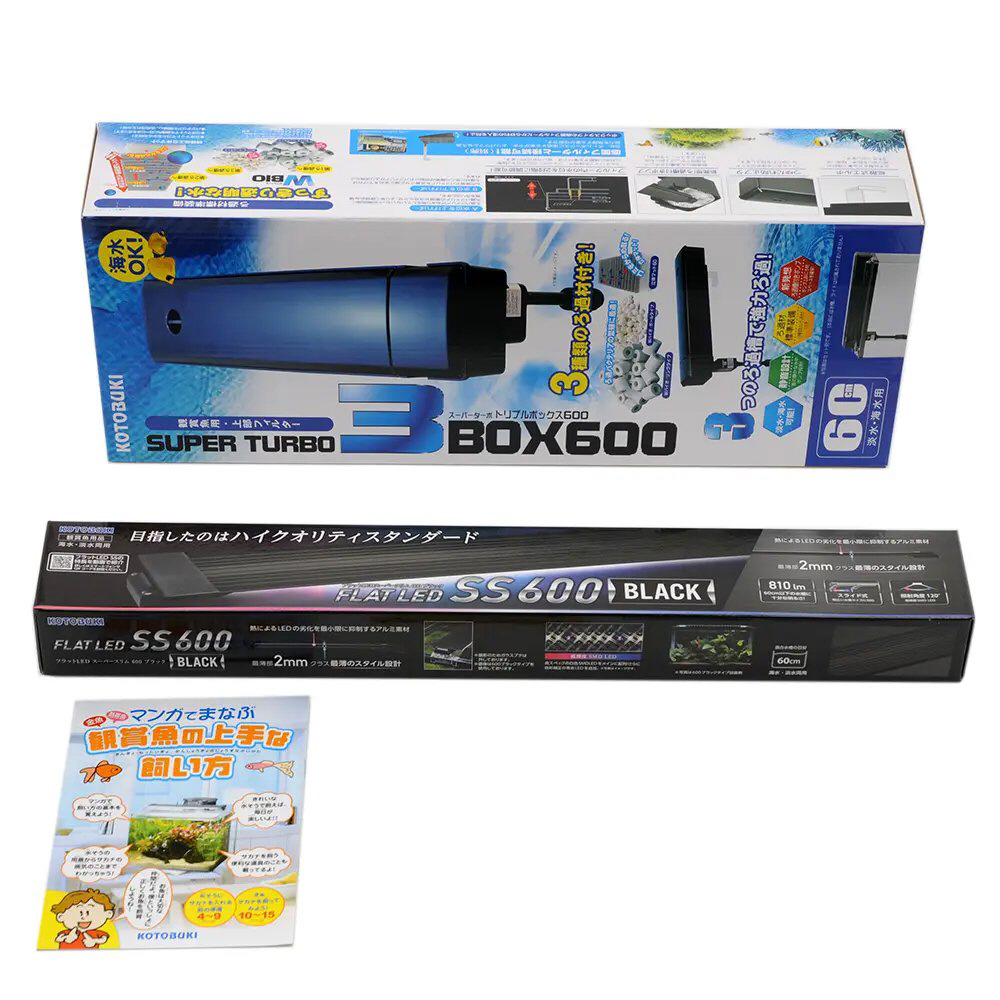 60cmフレーム付きガラス水槽:「コトブキアクアリスト600S」(「コトブキガラスフタKG−5」1枚付)、LED照明:コトブキフラットLEDSS600ブラック、上部式フィルター:コトブキスーパーターボトリプルボックス600、飼育の手引き、各1個ずつ