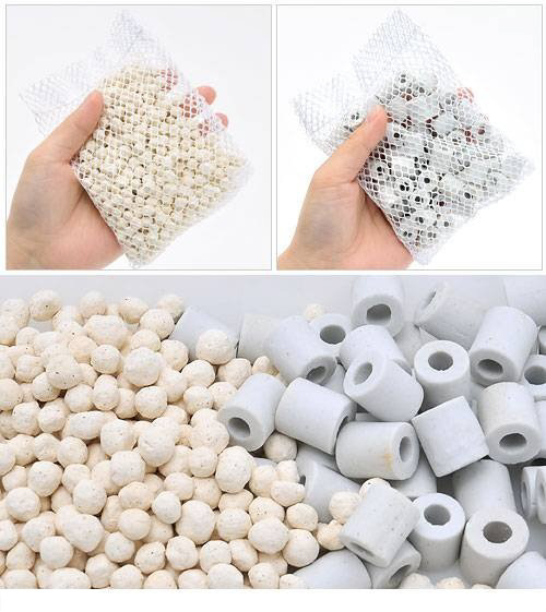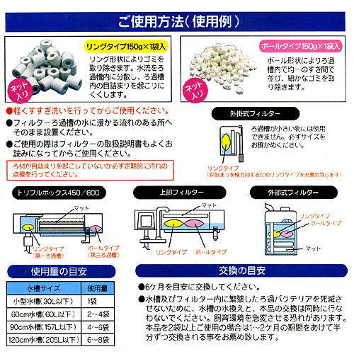 リングタイプ150g×1ネット、・リング形状によりゴミを取り除きます。水流をろ過槽内に分散し、ろ過槽内の目詰まりを起こりにくくします。、ボールタイプ150g×1ネット、・ボール形状によりろ過槽内で均一のすき間で並び、細かなゴミを取り除きます。