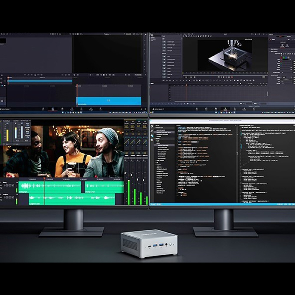 MINISFORUM NAB5Rは、Intel第13世代のCPU、Core i5-13500Hを搭載した高性能ミニPCです。12コア16スレッド、最大4.7 GHz動作の高性能CPUと16〜32 GBの大容量メインメモリ、512 GB〜1 TB M.2 NVMe 高速SSDを搭載することで画像や動画編集なども快適に行えます。HDMIとUSB-C端子を組み合わせて最大4画面同時出力が可能なため、最小限のスペースでマルチモニタ環境の構築にも対応します。