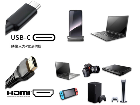 入力端子は?USB-C x2 (60Hz/最大65W給電)と?HDMI 2.0 x1 (60Hz) を?装備します。?付属の?120W電源アダプターを?使用する?ことで、?USB-C(最大65W)給電に?対応し、?モニターを?経由して?ノートPCなどの?外部デバイスへ?最大65Wの?電力供給が?可能です。?※USB-C(最大65W)給電を?行わない?場合でも、?本製品の?ご使用には?製品付属の?電源アダプターからの?電源供給が?必要です。